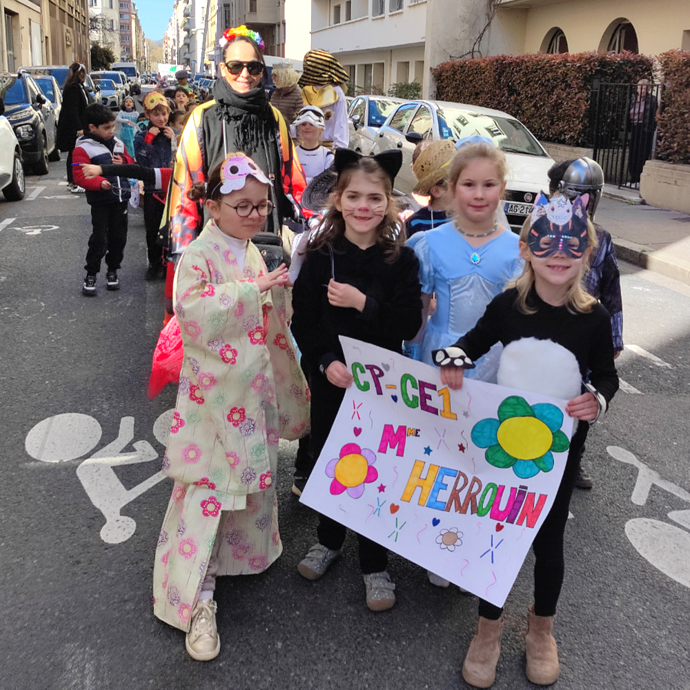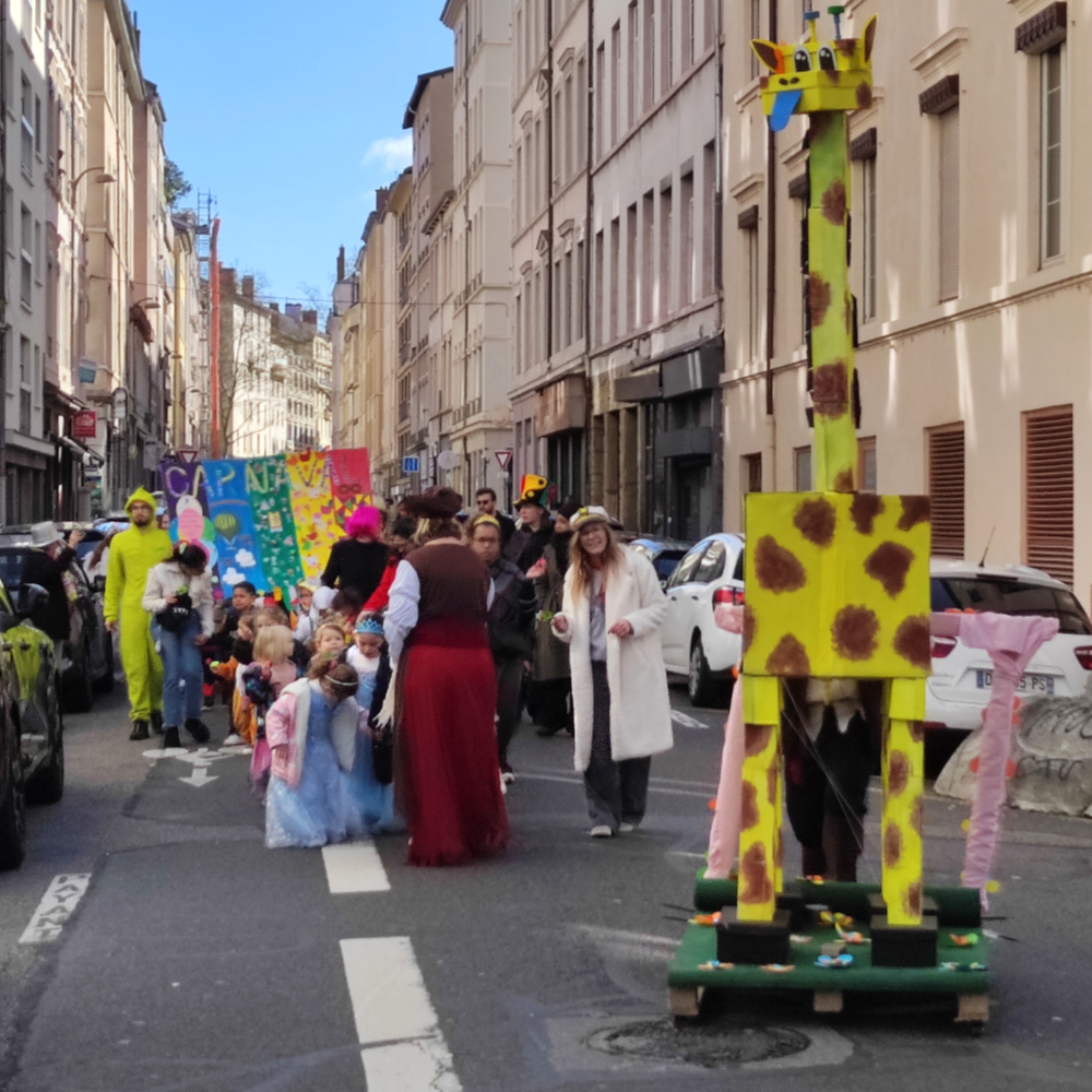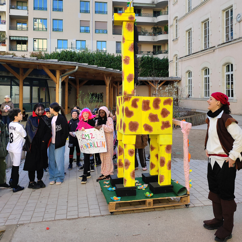Point d’orgue de la journée, un défilé a eu lieu en deux temps. Dès 9h, le convoi des plus grands (CE2, CM1 et CM2) s’est mis en place puis a effectué un parcours autour de l’école sous l’oeil admiratif de nombreux parents et de quelques élus de la mairie du 6ème. Une mascotte géante représentant une girafe grandeur nature fabriquée par l’équipe périscolaire clôturait le défilé. Puis les élèves de CP et CE1 accompagnés des classes de maternelle ont pris le départ vers 10h effectuant le même parcours sous des airs de samba et de chansons apprises en classe.