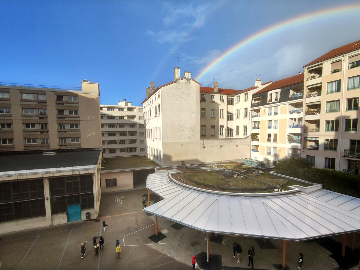 C’est sous une météo on ne peut plus adaptée que les élèves de l’école ont pu profiter du préau enfin terminé ce lundi 6 novembre, jour de rentrée des vacances. En effet, les averses se succédant, ils ont pu s’abriter sous un préau vaste et lumineux. Et le retour fugace du soleil nous a offert un bel arc-en-ciel pour fêter cet événement !